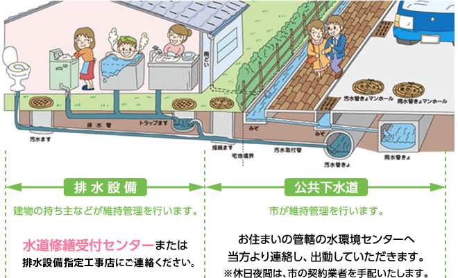 での水漏れ等の水道トラブルは水道修繕受付センターにお任せください。