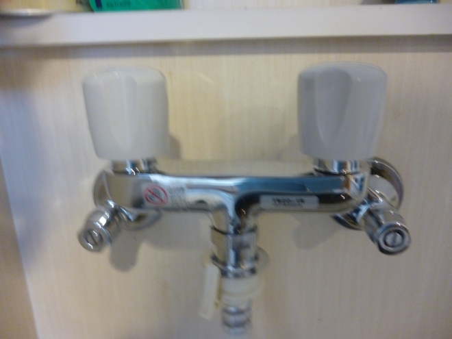 灘区マンションT様邸ー洗濯機の混合水栓が老朽化して漏水したので、緊急止水弁つき2ハンドル混合栓TOTOのTW20-1Rに取替えました。