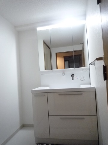 今まで1350の大きな洗面化粧台でしたが、サイズを少し小さくして900にしてあいたスペースは移動できる収納のものを置くということになりました。洗面化粧台はTOTOオクターブです。そのため、壁・天井のクロス、床のクッションフロアは張替えです。