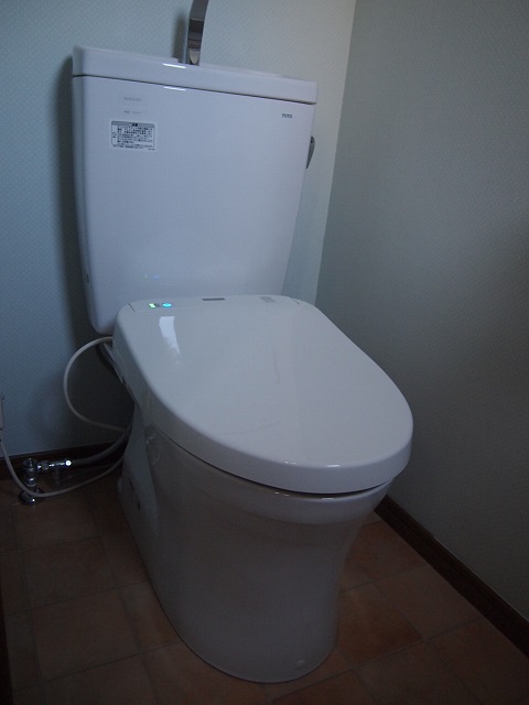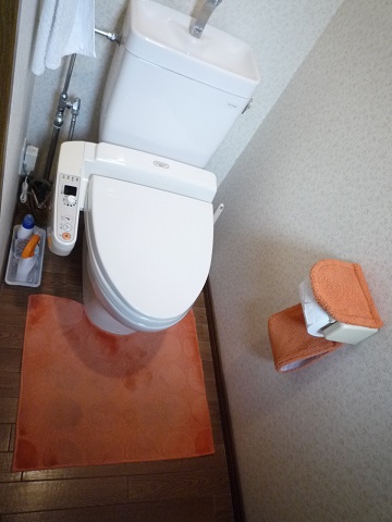TOTO節水トイレピュアレストQR+ウォシュレットアプリコット組み合わせさせていただきました。壁のクロスは水色に小さな水玉で、初めて見るクロスだったのでどんな感じになるのか、楽しみにしていました。床のテラコッタのクッションフロアととても合っていて水玉も主張しすぎず、素敵でした。
