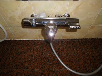 既設の浴室混合栓シャワーが老朽化して漏水したので、TOTOのオートストップ水栓自閉式TMF49E3サーモスタットシャワー混合栓に取替えしました。