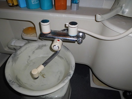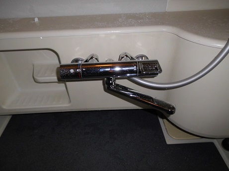既設の2バルブ浴室混合栓が老朽化して漏水していたので、TOTOのTMGG40Eサーモスタットシングルレバー混合栓に取替えしました。