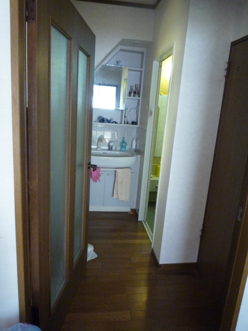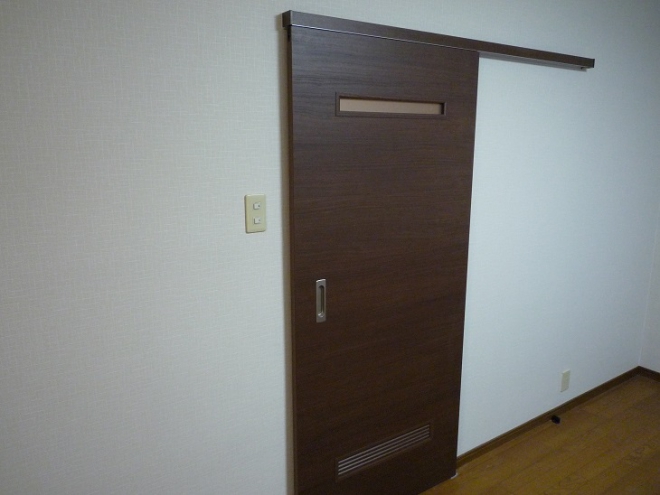 開きのドアからダイケンのアウトセット吊戸片引に取替えました。今後、車椅子になったとしても簡単に開け閉めができ移動がしやすいのでこのドアに取替えました。
