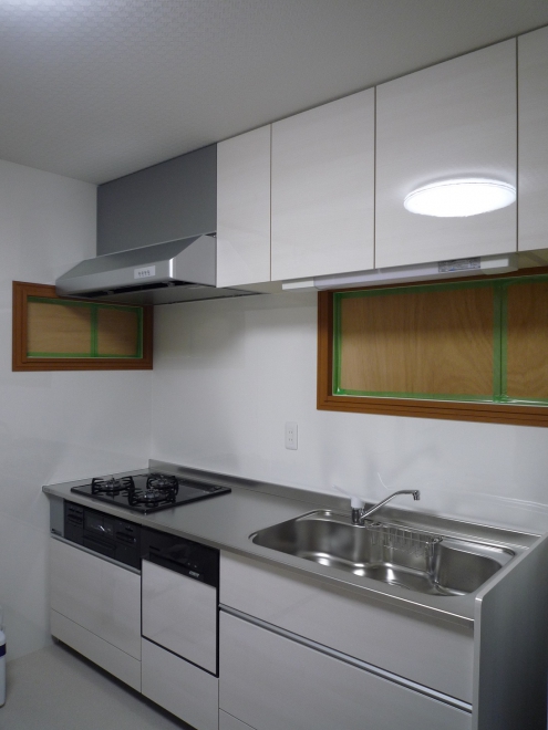 商品はノーリツレシピアです。食洗器とお手入れ簡単なレンジフードを選ばれました。カラーはシンプルなパールホワイトです。窓はこの後、YKKAPカバー工法で取り換えました。