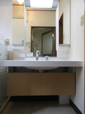 TOTOの洗面化粧台、座ってらくらくシリーズに取り替えられました。この洗面化粧台は壁に取り付けるので壁補強が必要になります。