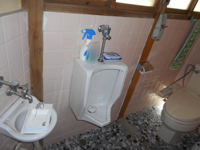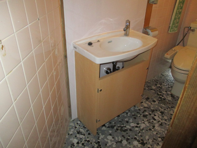 使っていなかった小便器を取り洗面化粧台を取付ました。洗面化粧台の後ろにはキッチンパネルを貼りました。TOTOモデアシリーズ、スリムタイプです。
