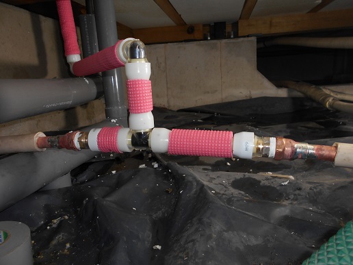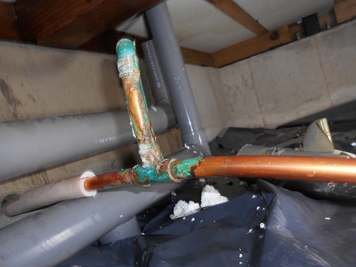 床下の給湯配管が老朽化して漏水していたので、13ポリブデン管で修理改善しました。