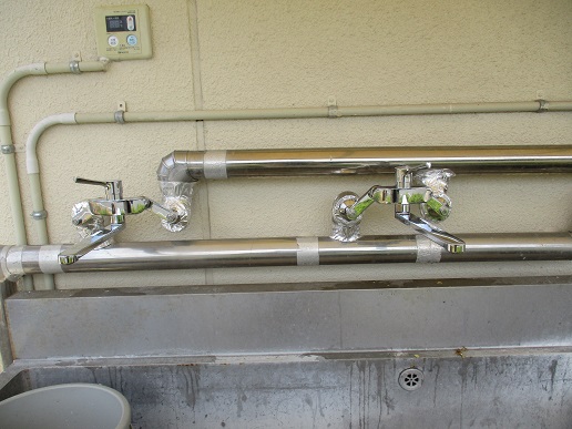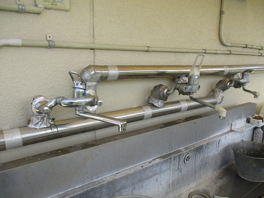 既設の屋外流し台の壁付混合水栓2箇所が老朽化して漏水していたのでTOTOの壁付シングル混合栓TKS05311Jに2箇所取替しました。