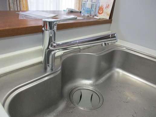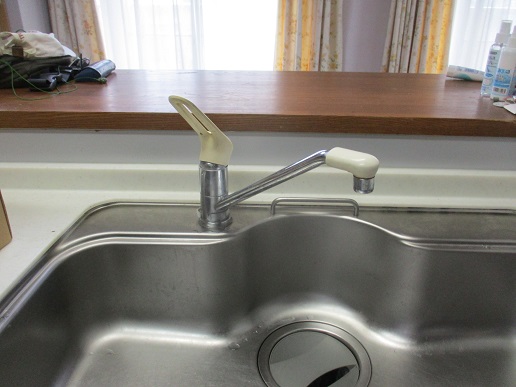 既設のキッチン混合水栓が老朽化して漏水していたので、TOTOの台付きシングル混合水栓(ハンドシャワー・吐水切り替えタイプ)TKS05305Jに取替しました。
