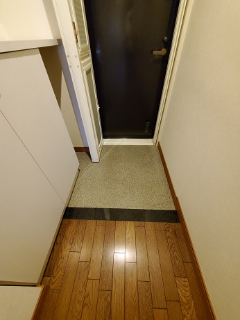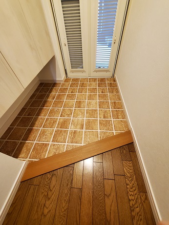 玄関が暗くて狭く感じるということで、キッチンの床と合わせてテラコッタ調のフロアタイルに。框を斜めにしたことで玄関が広くなったと喜ばれました。