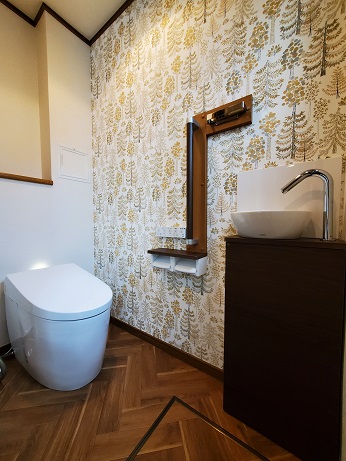 TOTO一体型便器ネオレストAS2・コンフォートシリーズSサイズを選ばれました。おばあ様の為に暖房機能がある商品にされました。水栓は自動水栓、水が飛ばないようにバックパネルも付けました。クロスは1面、落ち着いた木の柄を選ばれてとても素敵な空間に仕上がりました。