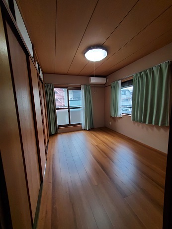 畳が古くなり、お孫さんが遊んでいたら靴下に畳がついてしまうとの事で、 フローリングにされました。(DAIKENハピアフロア)ふすまも当たって破れたりするので特注ですがDAIKENのクロークにされました。2枚のふすまの時より、開口広いので物の出し入れはし易くなります。