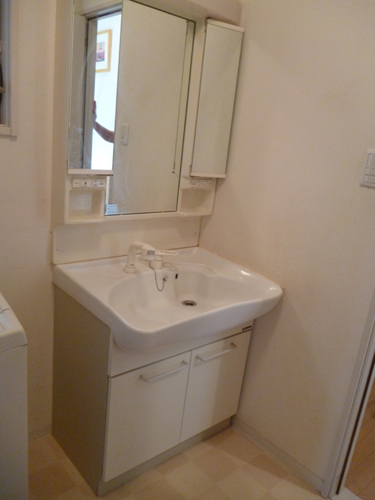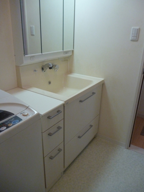 洗面化粧台付け替え工事、床クッションフロア貼り替え