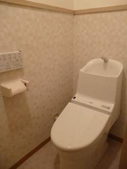 ウォシュレット一体型で、手洗いも深く洗いやすい節水型トイレを選ばれました。クロスは奥さまが選ばれ、床のクッションフロアとバランスがいいと、喜んで下さいました。明るい、おしゃれなトイレに変身しました。