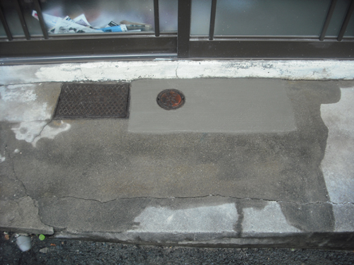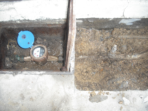 メーター1次側の鉛管が老朽化して穴があいていて水が噴き出ていました。ビニール管HIVP13に改善して修繕しました。モルタル復旧しました。